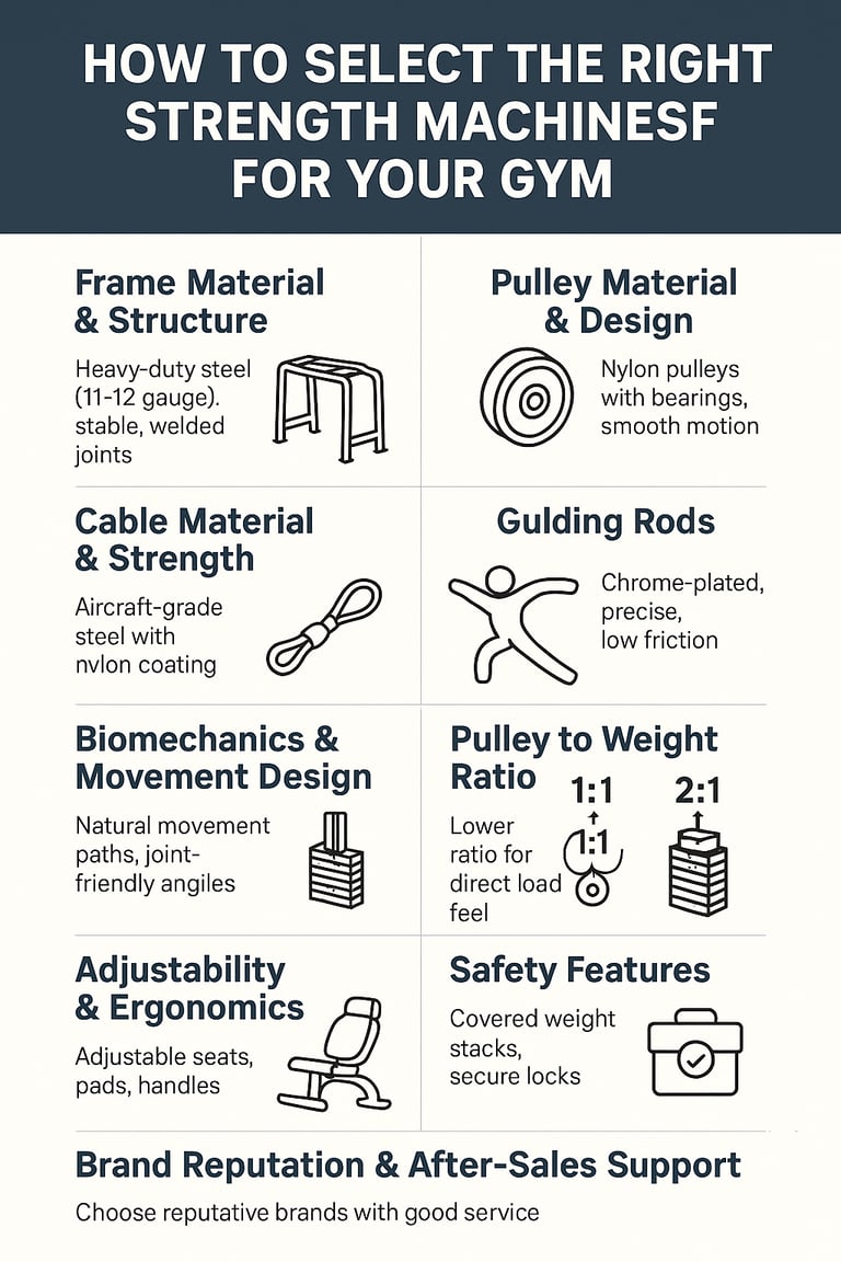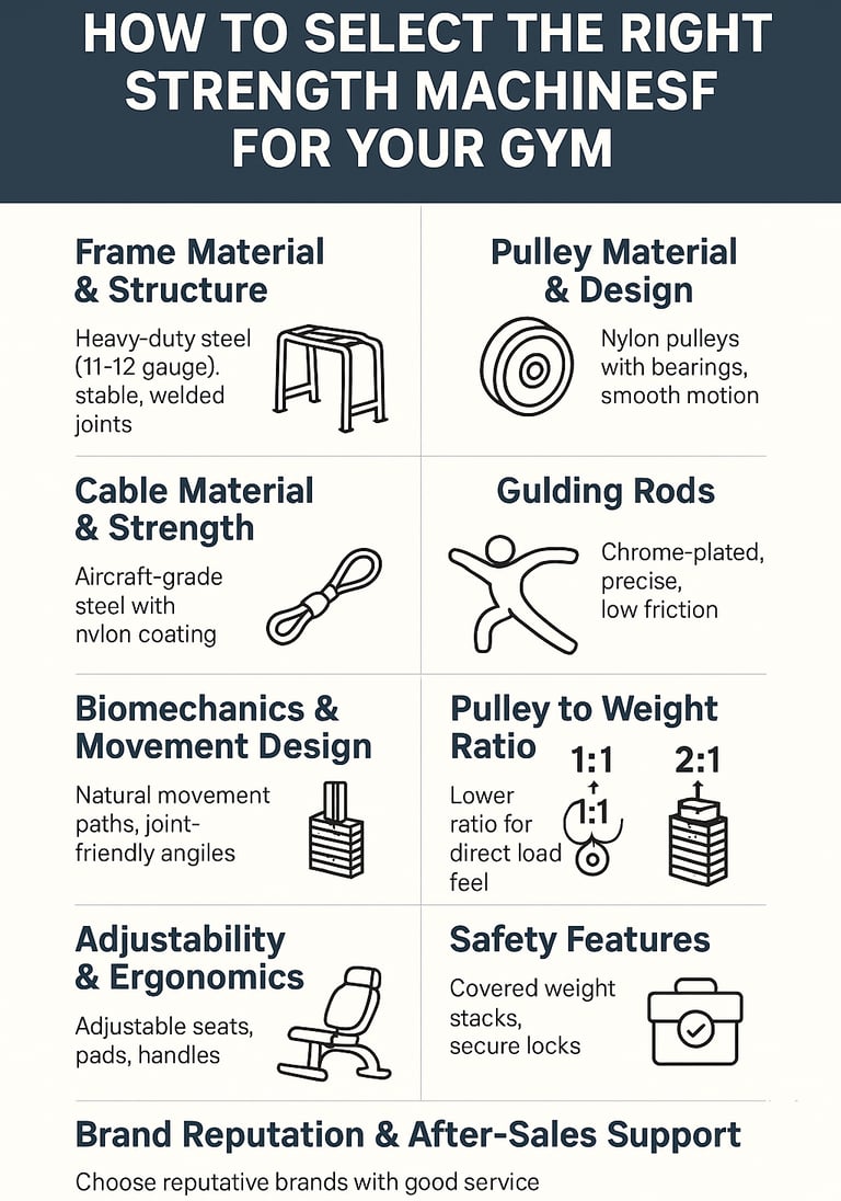 Planning a gym setup? Learn 9 key factors—frame, pulleys, cables, guiding rods, biomechanics, pulley ratios, safety, and service—that define premium strength machines.
